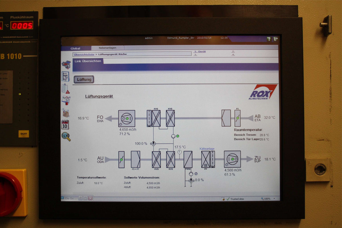 Die frei programmierbaren pCO-Regler bilden den Mittelpunkt der ROX DDC-Regelung. Auf ihnen wird die Programmlogik gespeichert und ausgeführt. Alle Feldgeräte laufen hier zusammen. Mehrere Regler können über ein internes Bus-System miteinander kommunizieren, wodurch Erweiterungen oder eine Zusammenschaltung mehrerer Anlagen ermöglicht wird. ROX-Regelungen arbeiten stets nach dem neuesten Stand der Technik und werden darauf optimiert, einen möglichst energieeffizienten Anlagenbetrieb sicherzustellen. Es besteht die Möglichkeit einer Datenaufzeichnung, wodurch eine Analyse und Optimierung der Anlage auch nach der Inbetriebnahme ermöglicht wird.
