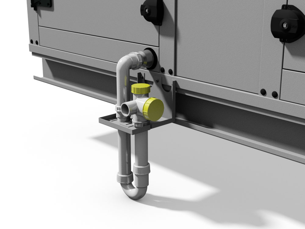 ROX-Siphon mit Schraubdeckel zur Füllung und Revision, zur Entwässerung von RLT-Geräteteilen mit Überdruck gegenüber der Umgebung, variable Ablaufanordnung und veränderliche Einbauhöhe. Geeignet für maximalen Überdruck von P = 1700 Pa bei Sicherheitsfaktor 1,5 für Druckschwankungen im System.
