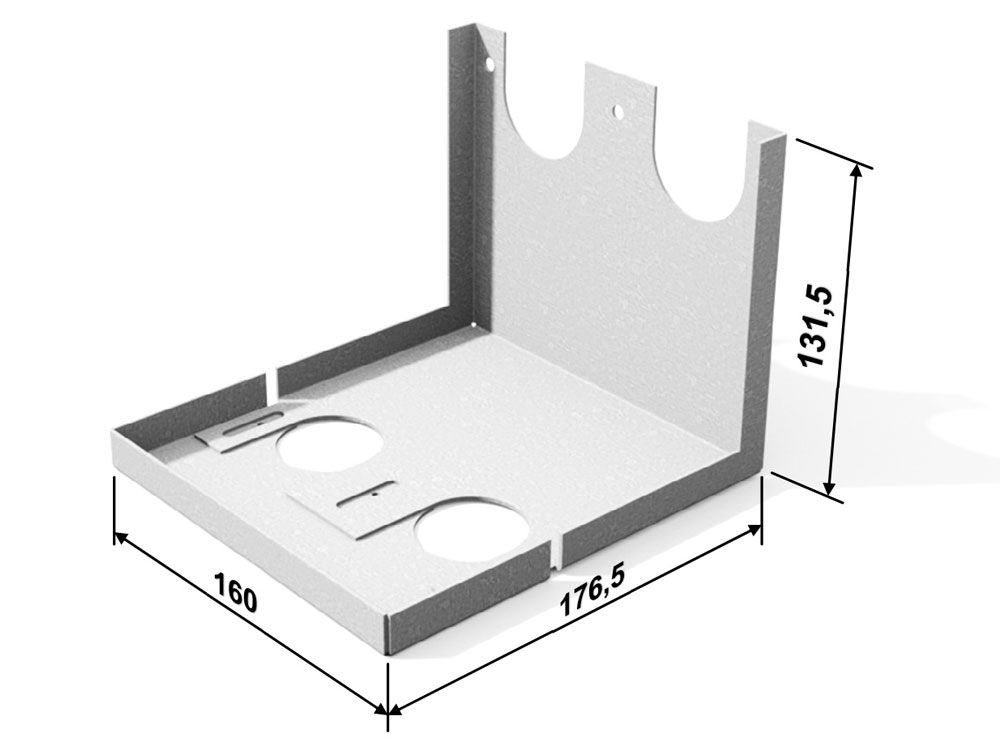 Halterung für Syphon, Größe 160 x 176,5 x 131,5 mm. Material: Lackiertes verzinktes Stahlblech, Dicke t = 1,5 mm.