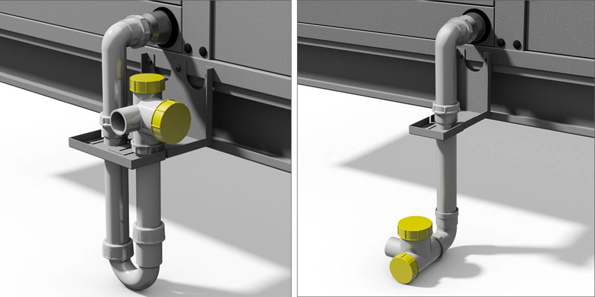 Den betriebssicheren Ablauf von Kondensat aus Kühlersektionen oder anderer Nassbereiche ermöglichen die speziellen Rox-Siphons. Der Typ SN ist selbstfüllend mit Rückschlagventil und erlaubt die Entwässerung von Gerätesektionen mit Unterdruck gegenüber der Umgebung. Im trockenen Betriebszustand wird die Ansaugung von Luft verhindert.